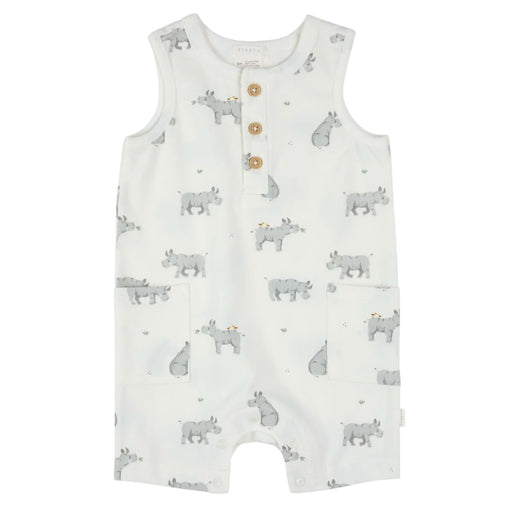 Petit LemBaby will stay comfortable on the hottest days in this stretchy organic-cotton henley romper printed with peaceful-looking rhinoceros and finished ...