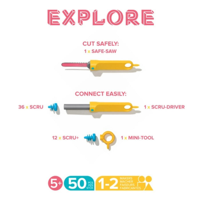 - The Explore Kit includes 50 pieces (1 x Safe-Saw, 1 x Scru-Driver; 36 x Scru (connects up to 3 layers), 12 x Scru+ (connects up to 5 layers), 1 x BONUS Mini-Tool). All packed in a handy carry and store toolbox.