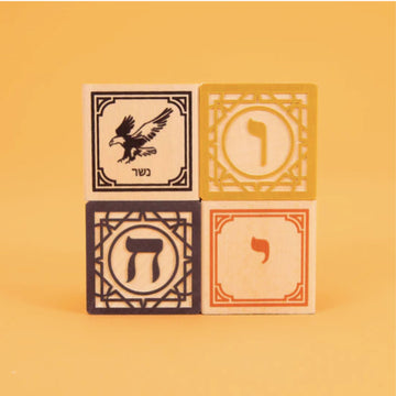 Explore the Hebrew language and teach children about heritage with these Uncle Goose Hebrew Language Blocks. Enjoy the filigree of interlacing triangles that surrounds two embossed letters on each block. Two other sides show one number and one animal paired with their Hebrew translations. The remaining sides contain more hand-crafted letters, including the five soffit forms.