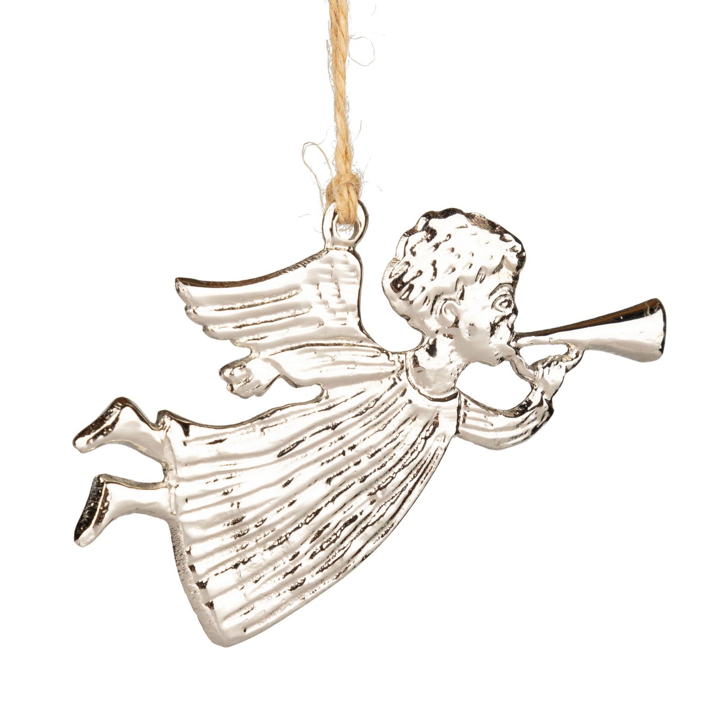 Expertly crafted with a textured finish, this Silver Angel Ornament adds a classic touch to any holiday decor. This metal ornament is the perfect addition to your collection, featuring a festive horn. Spread the holiday cheer with this elegant piece.