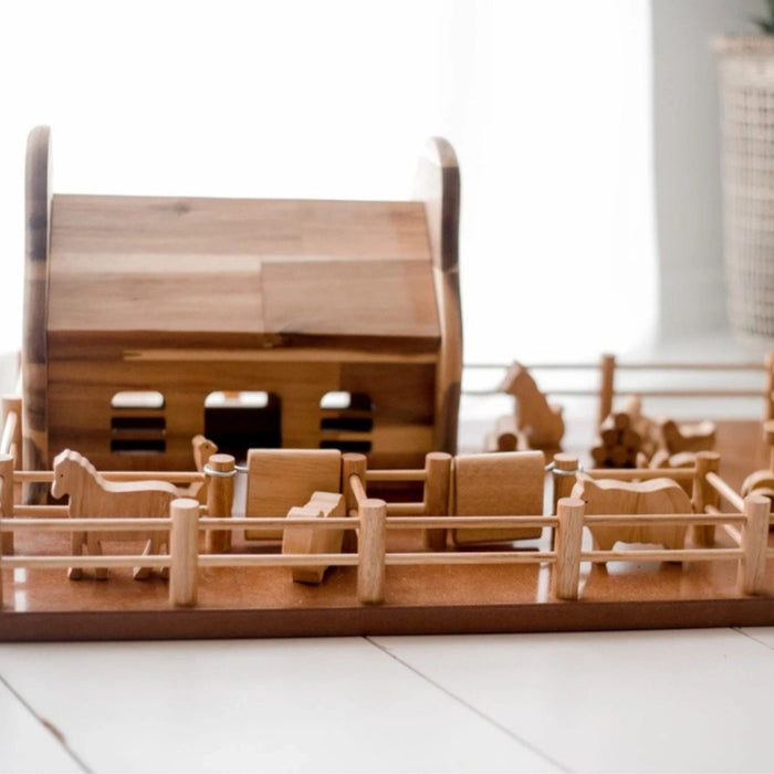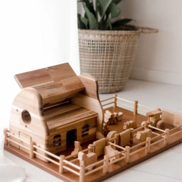 The Farm Barn is a beautifully crafted wooden playset designed to inspire endless hours of imaginative play. This signature piece adds charm to any play space with its good size and solid structure, complete with a fence surrounding it. The set includes all the animals and a tractor, as depicted in the picture, providing children with everything they need to create their farm adventures.