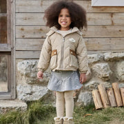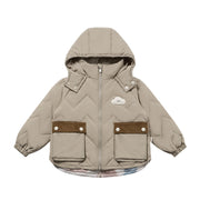 Taslon Kids Quilted Down Jacket that feels like being hugged by clouds—pillowy soft with a cozy hood, corduroy accents, and a sweet little cloud detail.