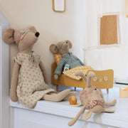 Maileg offers bigger mice. They are oh-so huggable. These charming mousey features are even more apparent in their medium size, and they are a perfect friend to tote around anywhere and everywhere. With many different looks, you can choose your style and fit your snuggly friend into your story however your imagination sees fit.