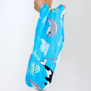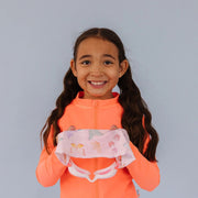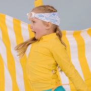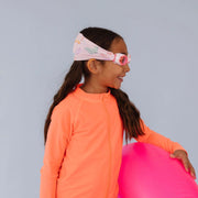 Splash Swim Goggles features a tangle-free, patent-pending strap in fun colour prints with a white frame and lightly tinted blue lenses.