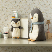 A penguin is a funny character. It is made of soft fabrics and has pellets in the back to easily sit. The medium penguin wears a warm scarf for cold days.