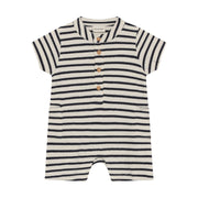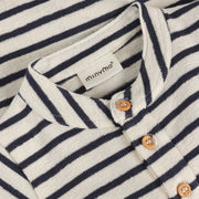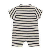 The organic cotton romper in blue stripes brings playful charm to baby boys’ summer wardrobe. This short-sleeve one-piece features a round neckline, buttons at the collar, short legs, and convenient bottom snap closures for quick changes. Made from breathable organic cotton, it is a comfy and stylish essential for a nautical look.