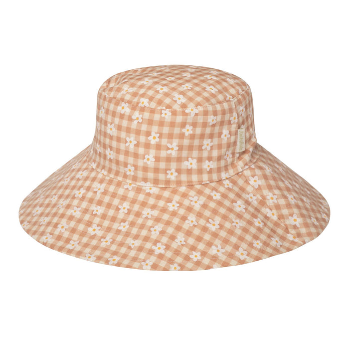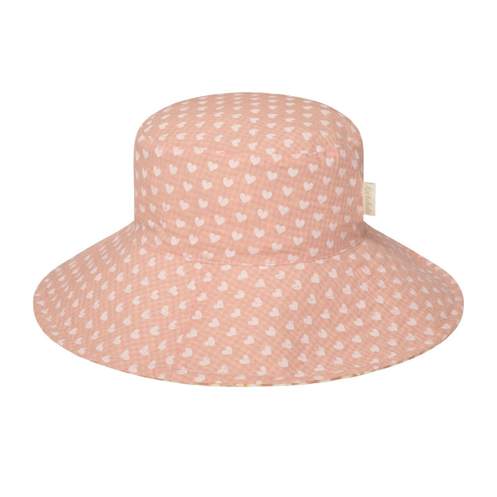 Stay protected from the hot summer sun in this fun daisy gingham sun hat! Fully reversible with the sweet daisy gingham print on one side and our pink heart print fabric on the other. With a wide brim for extra shade, it is a totally practical hat for adventures in the garden, the park or on holiday!