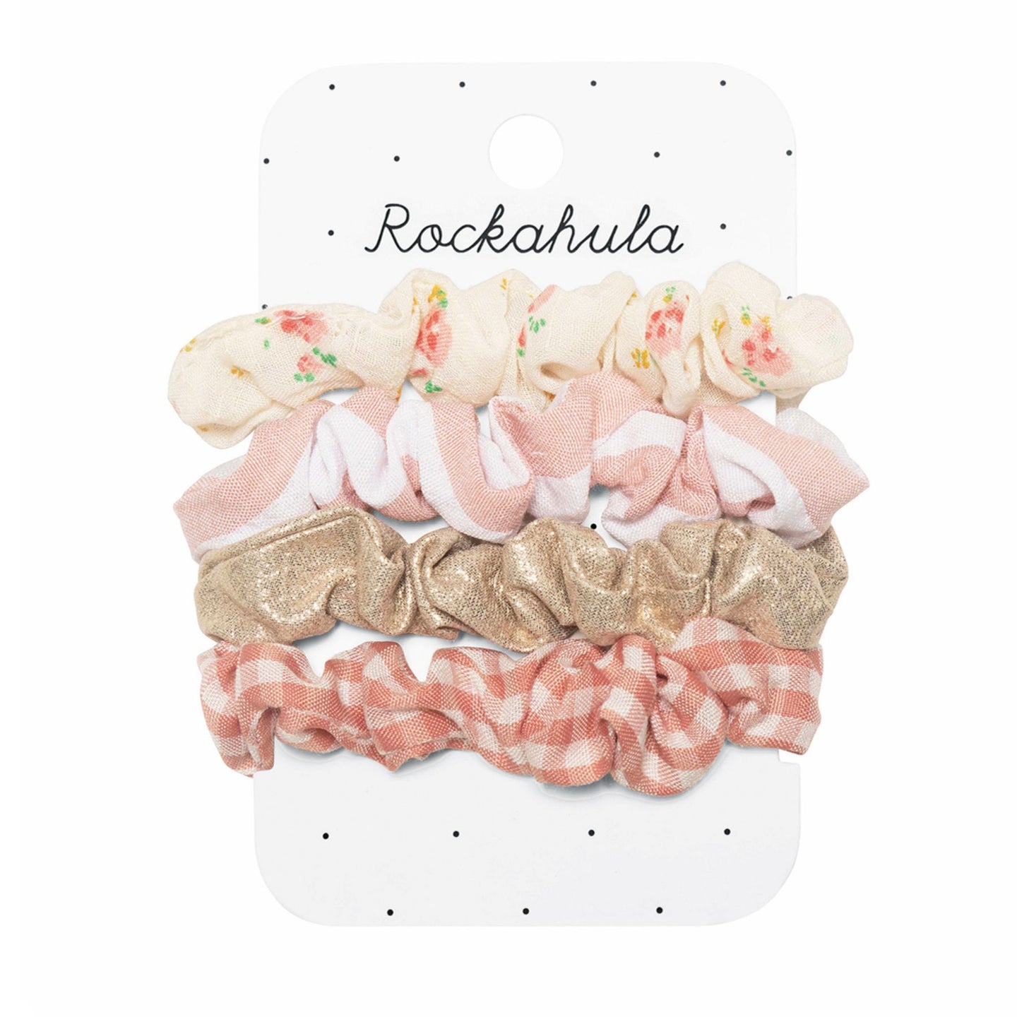 A pack of four sweet and wearable scrunchies, each in a different beautiful fabric. Featuring the signature tiny blossom print, a shimmering gold, gingham check and pink striped fabric - these are the perfect scrunchies for any adventures.