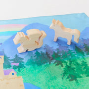 This Magical Creatures set Sarah's Rainbowland Playmap and Rainbow Unicorn Playmap for magical creatures-themed world play! Crafted with untreated maple wood in California, this enchanting wooden toy is perfect for bundling with Playsilks for limitless imaginative play.