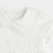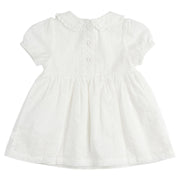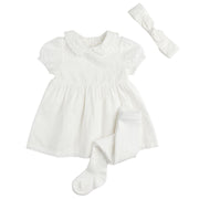 This adorable White Eyelet Dress + Tights Set is a 3-piece dress set that is a dreamy outfit for family photos, weddings and passing down through the generations. It features a sweet Peter-pan collared dress, tights, and a matching headband, as well as everything they need to feel and look their best. The dress is made from a light, breathable organic cotton eyelet and finished with a little collar and frilly trim. It fastens at the back and will be their new favourite thing to wear – even on an ordinary day! The headband has a sweet bow at the front and is gently elasticated for a comfortable fit.