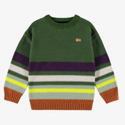 Green dropped-shoulder knit sweater with round collar and a pattern that gives a handmade look with colourful stripes in shades of green, beige, yellow, plum and caramel.