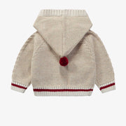 Long-sleeved raglan knit cardigan with a braided pattern, relaxed fit, pointed hood with small pompom, front opening with imitation wood buttons, made from a cotton/polyester blend.