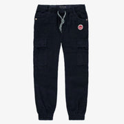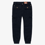Navy pants with side cargo pockets and back flap pockets. The corduroy fabric and the relaxed fit jogger style give this garment a chic, on-trend look. Nevertheless, these pants are versatile and easy to match. Your little one can wear them all season long.