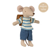 The Maileg Tricycle Mouse, Big Brother, is dressed for a day in kindergarten or school as she/he brings her/his backpack. The Tricycle mouse has magnet hands, so she/he can hold the tricycle handles tight for a fast trip.