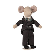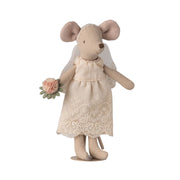 A beautiful love story that starts on the wedding day of these two mice (Mun and Dad). They are dressed classically in a long white dress, a lace veil, a bouquet, a tuxedo, and 2 metal stands. They come in a beautiful box decorated with Maileg ocher floral print.