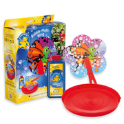 The Pustefix Multi Bubble Wings guarantees tons of fun as you enthusiastically wave the fan back and forth. After immersion in the PUSTEFIX soap bubble liquid tray, the liquid film covers the small punched holes in the surfaces of the Bubble-Multi-Wing. Wave the fan and, as if by magic, myriad colourful bubbles dance in the air. The pretty, flower-shaped fans have three motifs: PUSTI the bear, a cutesy unicorn, a butterfly and a mighty green dinosaur.