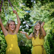 Just fill the modified XXL-Bubbles liquid in the tray and dip in the lace. Then remove the lace, keep it loose between the sticks and pull it through the air. Create multi-loops for fantastic and long-lasting soap bubbles.