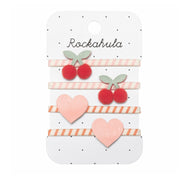Stay sweet with this set of four stripy cherry ponies! Fun pompom cherries with detailed green stems adorn two pink striped elastics, while two cute pink love hearts adorn the other two order striped elastics.