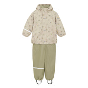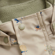 Fine CeLaVi rainwear made of PU in beige with a bright variety of garden bugs print, consisting of a rain jacket, a pair of rain pants with suspenders with practical reflectors.