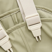 - The Rain pants have adjustable elastic straps that can be opened at the front with snap fasteners. The Trousers can be tightened at the sides with a push-botton. The Rain pants have elastic edges around the leg openings and adjustable, removable elastic straps to put under the rubber boots.