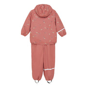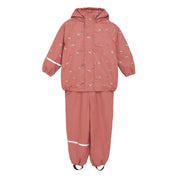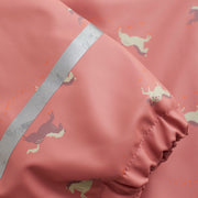 Fine CeLaVi rainwear made of PU in dark dusty pink with a bright wild horse print, consisting of a rain jacket, a pair of rain pants with suspenders with practical reflectors.