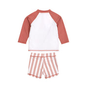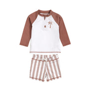 This cool, Petit Lem Raglan Rashguard + Swim Short Set, Palm Tree with stripey trunks is perfect for a fun-filled day by the pool. Whether they’re splashing around in the water, or building sandcastles, the built-in UPF sun protection gives them that extra safety while in the sun.