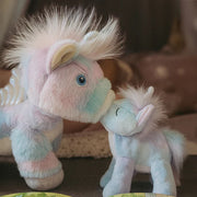 • Soft and cuddly rainbow plush outer with rainbow plush tail and mane, and iridescent hooves and horn