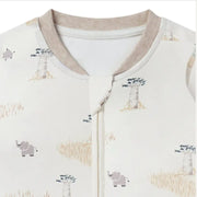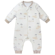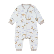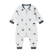 - Two-way zipper and snap buttons around the inner legs make diaper changes easier.