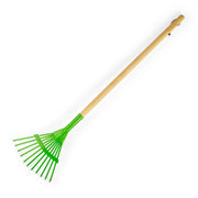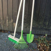 • This kid's leaf rake features a wooden body and an easy-to-grip handle for little fingers. It also has a sturdy green metal shovel head that can withstand lots of enthusiastic digging.