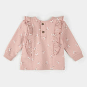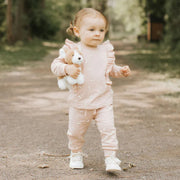 A cozy and feminine Daisy Print on Pale Pink set, perfect for busy days outdoors. This two-piece set includes a long-sleeved fleece top with a pretty decorative ruffle, and matching jogging pants for complete head-to-toe comfort. Designed for easy dressing, the top has a button closure at the back, and the pants have an elasticated waistband with an adjustable drawstring.