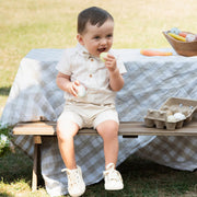 Perfect for special occasions through the warmer seasons, this 3-piece set includes a poplin shirt bodysuit, pale grey chambray shorts, and an adorable faux bow tie to complete the look. Made with organically grown cotton, the set is ultra-light and breathable, keeping him cute and comfortable all day long. The chambray shorts have an elasticated waistband and faux fly for a smart style that’s still easy to pull up and down for quick changing.