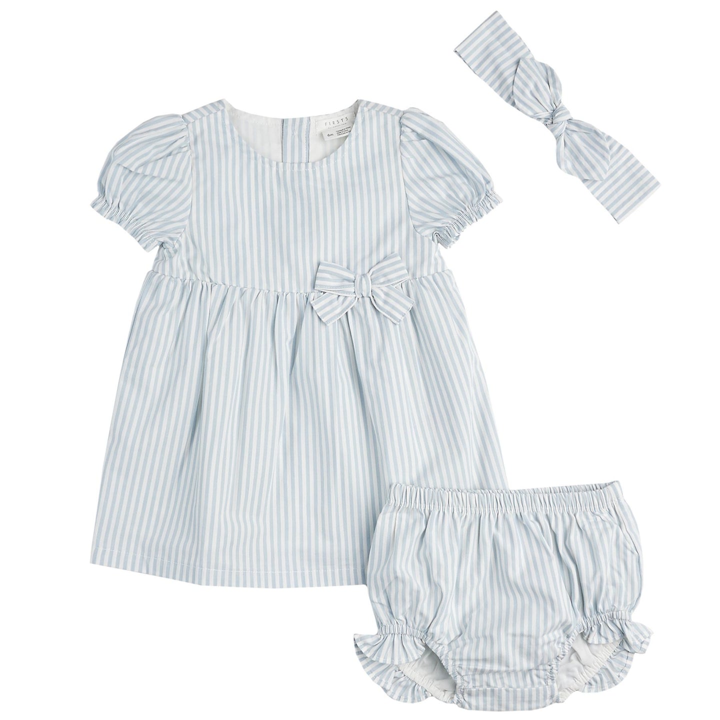 This Celestial Blue Yarn-Dyed Striped Woven Dress is a 3-piece dress set in Petit Lem's adorable occasion-wear collection. Made from a light, breathable striped poplin, the set features a sweet party dress, diaper bloomers, and a matching headband. The dress has a bow along the waistband and elasticated sleeves for a slightly puffy finish. A button at the back makes dressing over the head easier. The bloomers provide a snug fit over their diaper to keep it in place, and they’re finished with a frilly trim along each leg. The headband is gently elasticated with a bow on the front to keep them looking and feeling their best, no matter the occasion.